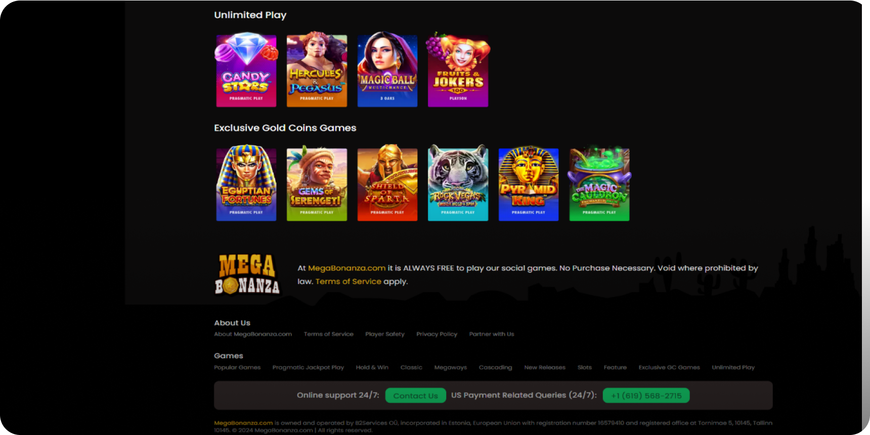 Is Mega Bonanza casino legit? We can confirm that this is a legitimate sweepstakes casino owned by B2Services OÜ, a company operated in Estonia, which also runs a few great sweeps casinos: McLuck, Hello Millions, and Jackpota. The mother brand complies with all gambling regulations. It ensures a high level of security by offering a full range of responsible gaming tools players can use.