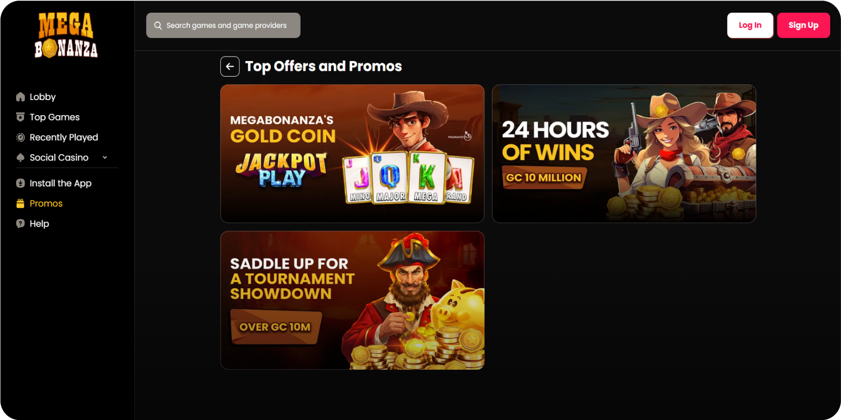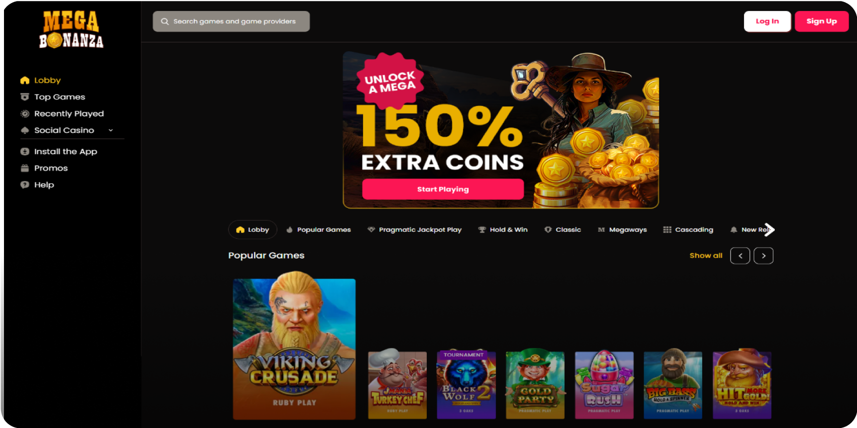 Mega Bonanza is a regulated and safe online social casino with excellent range of slot machines, SC prizes, generous welcome and recurring deals and services. The brand is operated by a proven company and currently offers about 800-1000 slots by prominent developers. Players have lots of ways to get free SC and GC. This fresh and authentic online sweeps platform will ensure a great time and free games. Let’s get started!