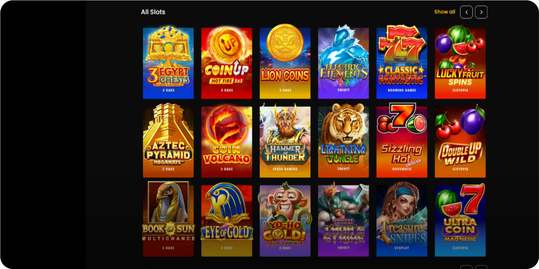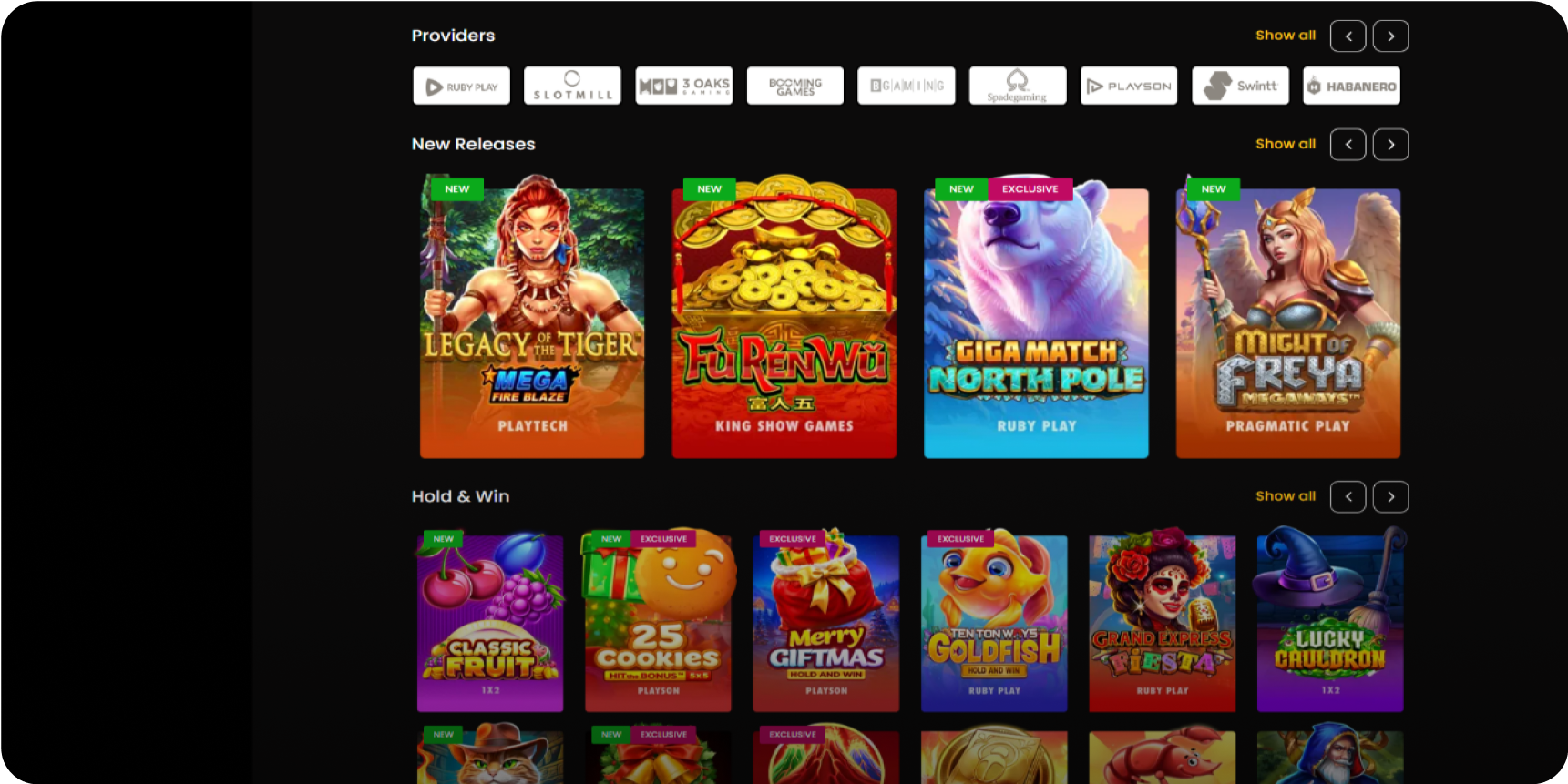 At Mega Bonanza there are slots from over 18 software developers, among which you will find prominent brands such as Novomatic, Pragmatic Play, Habanero, Playson, Fantasma, Evoplay, BGaming, and more. There are lots of smaller studios, including Relax Gaming, Slotopia, Gaming Realms, and more. Since no table titles like roulette or blackjack are available, the providers are entirely developers of slot machines.